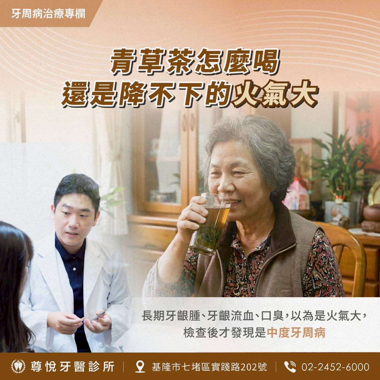 徐阿姨來到診所時有點不好意思地說:「最近刷牙常流血,牙齦也腫腫的,嘴巴還有味道,以為是火氣大,青草茶幾乎天天喝,但怎麼都沒什麼改善。」